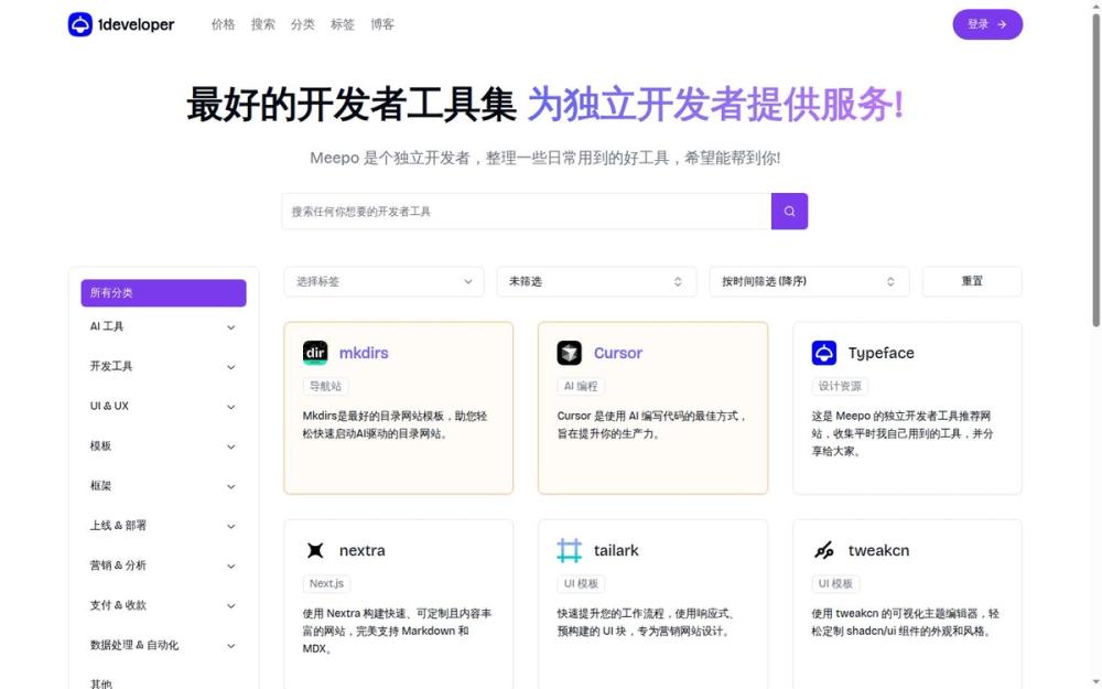 Meepo 的独立开发者工具推荐网站,致力于为开发者提供一站式的工具解决方案。无论是 AI 工具、开发工具,还是 UI 设计资源,这里都能找到适合你的工具。