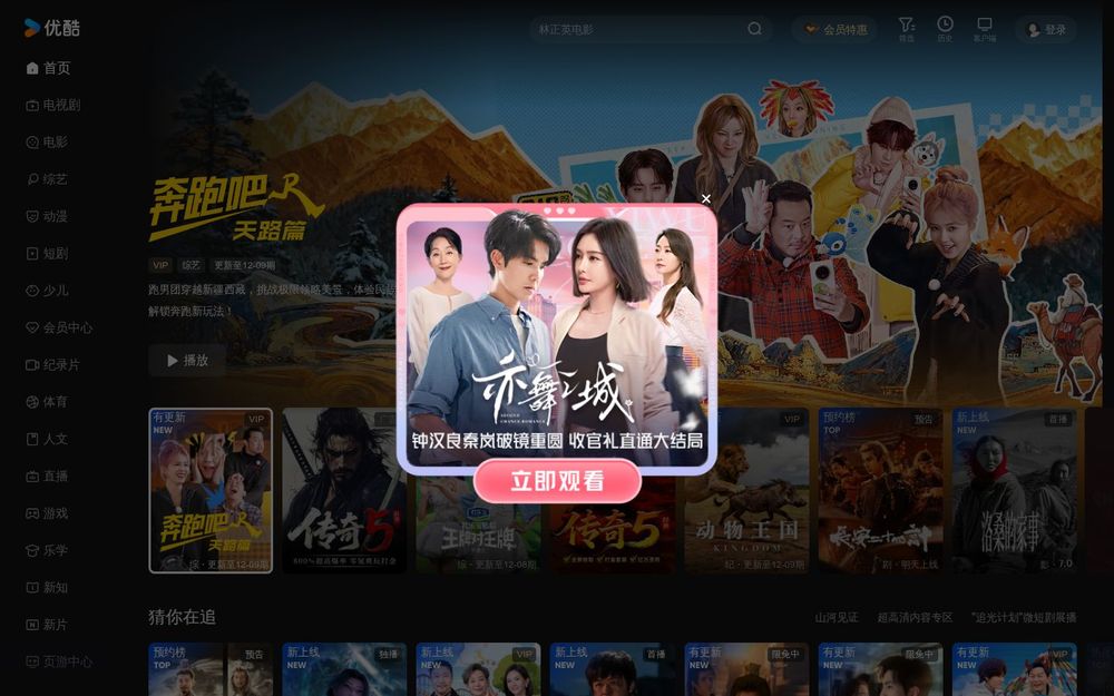 海量内容库: 优酷整合影视、综艺、动漫、纪录片等多类别视频资源,涵盖新片首播、限免剧集和经典回看,满足不同年龄层和兴趣的观众需求。